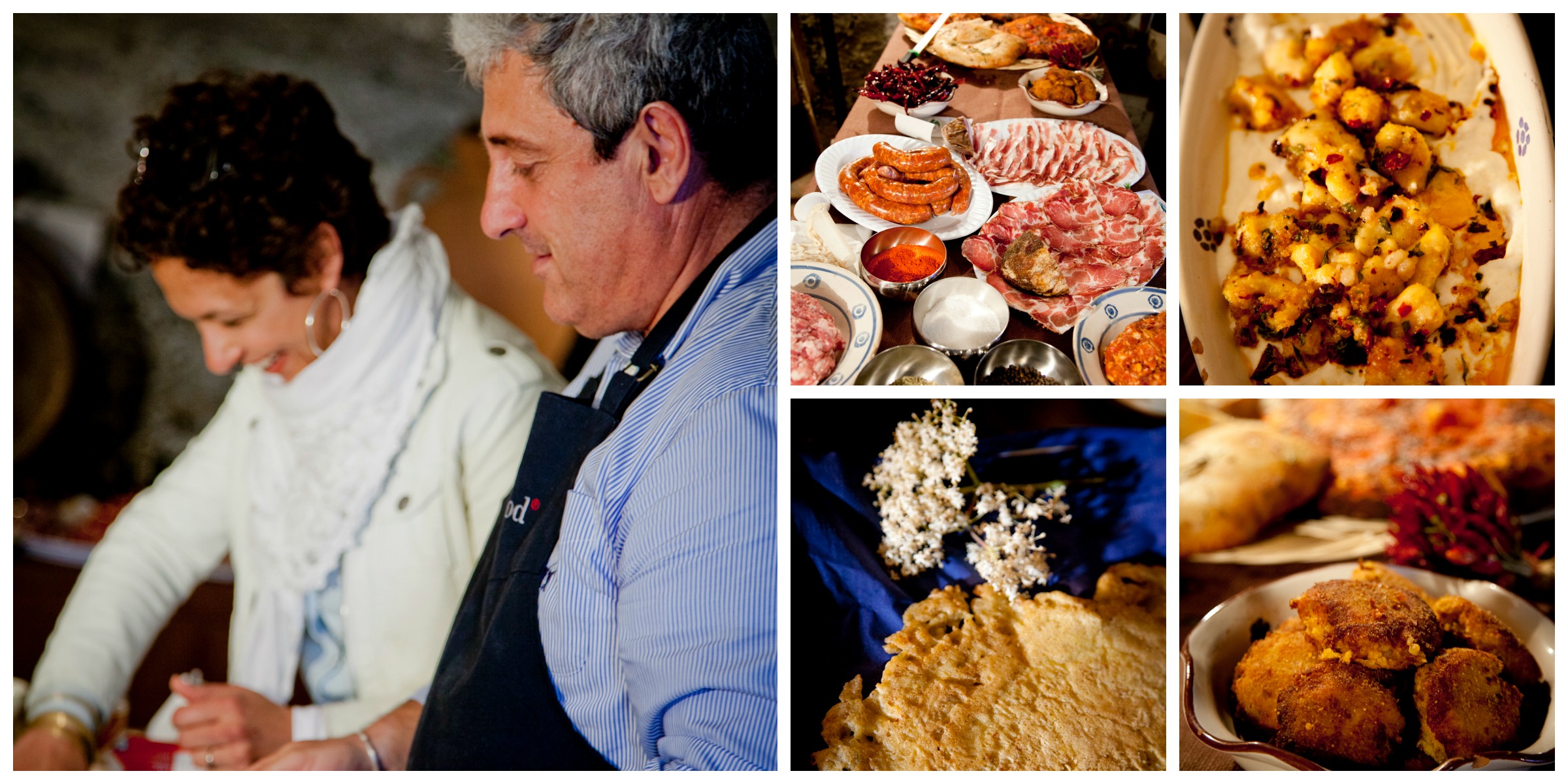 Our car barely squeezed between two others and made it to the top where at least 15 men from the village greeted us and led us into a dark man-made ancient cold room, a “cantina” carved right into the rock that served to preserve food in the past and is now being used as a get-together for the villagers -mostly men- to eat, drink and have fun. I have never seen anything like it. Chef and host Pasquale and friends had turned the cantina into a trattoria– buffet, where cured meats, fresh bread, pizzas and foccaccias made with local spelt flour, were beautiful laid out for us to indulge in. And yes, there was more to come. These were appetizers, not the recipe I was called in to capture. As Pasquale explained: “today I will divulge the secrets in my invented pasta dish: “Gnocchi con tartufo e fondue di formaggi” Gnocchi pasta with truffles and cheese fondue…. “O Dio” I said and that wasn’t all, a few other friends decided to show us how to make “frittelle al sambucco” a thin omelet perfumed with sambuco flowers freshly picked just moments before adding them to the mix.
