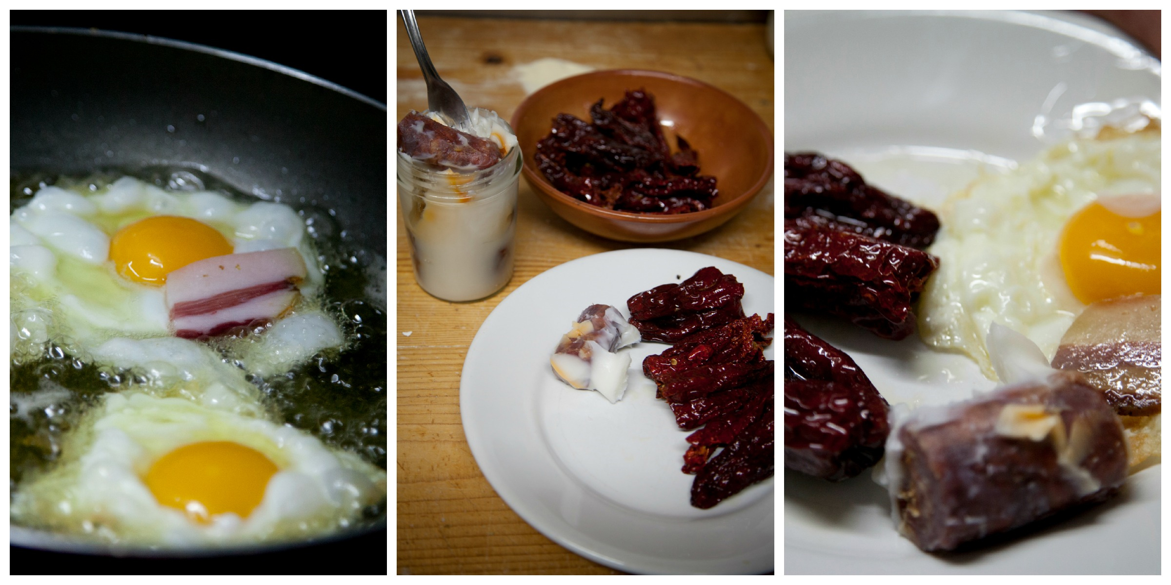 Elena fed us “il piatto dei vacanti”, the nomads’ meal. One might call it a rustic version of the québécois “coureur des bois” breakfast. This was something I had never seen before. Apparently, due to its isolated geographic position, virtually no one had store-bought food. This dish was one for the unexpected visitor and mostly for those who were travelers in need of hardy food, knowing not when their next meal would be. “Il piatto del vacante” consists of a fried egg, a piece of home-made and locally cured sausage, “cotica”, a thick slice of cured local bacon and fried “pepperoni cruschi” on the side.